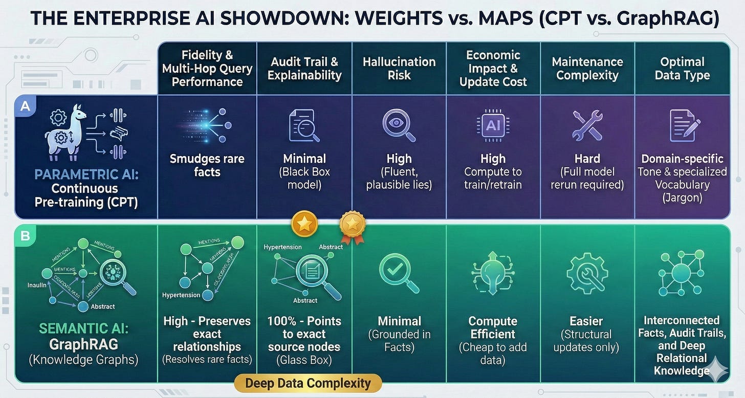 For the last couple of weeks, we have been running a high-stakes contextual “Bake-Off.” We pitted the reigning champion, a model fine-tuned using Continuous Pre-training (CPT) on specialized clinical data (the “Parametric Contender”), against a baseline model augmented by a structured Graph Substrate (the “Semantic Contender”).